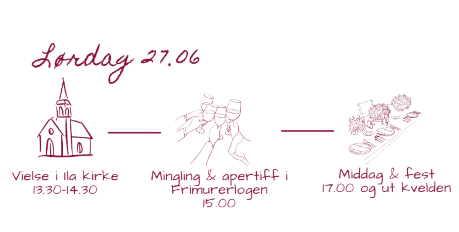 Vi vier oss i Ilen kirke 13.30 og ønsker at gjester møter opp i god tid. Fra Ilen kirke er det mulig å spasere bort til Frimurelogen, hvor bryllupsfeiringen vil holdes resten av kvelden. Før brudeparet ankommer blir det lett servering for gjestene.